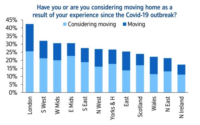 Interestingly, around 10% of those surveyed in September said they were moving as a result of the pandemic, with a further 18% considering a move for the same reason. This pattern was evident across the country, especially in London, as shown in the chart below.